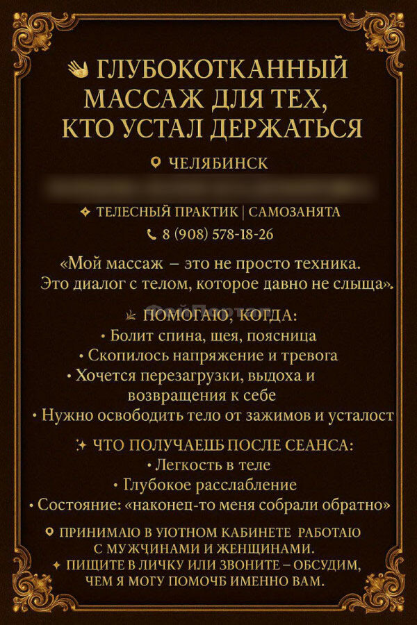 Юлия , Челябинск, 40 лет 170 см., 65 кг., № 3 💆♂️ *Приглашаю на классический расслабляющий массаж и тайский традиционный!* Хотите отдохнуть от суеты и снять напряжение? Тогда я приглашаем вас на сеанс классического расслабляющего массажа или традиционного тайского массажа! Я помогут вам расслабиться, избавиться от стресса и усталости. Вы почувствуете себя обновлённым и готовым к новым свершениям. 🎁 *Это подарок для вас!* Не упустите возможность насладиться профессиональным массажем и получить заряд энергии и хорошего настроения. Запишитесь на массаж прямо сейчас и подарите себе незабываемые ощущения!